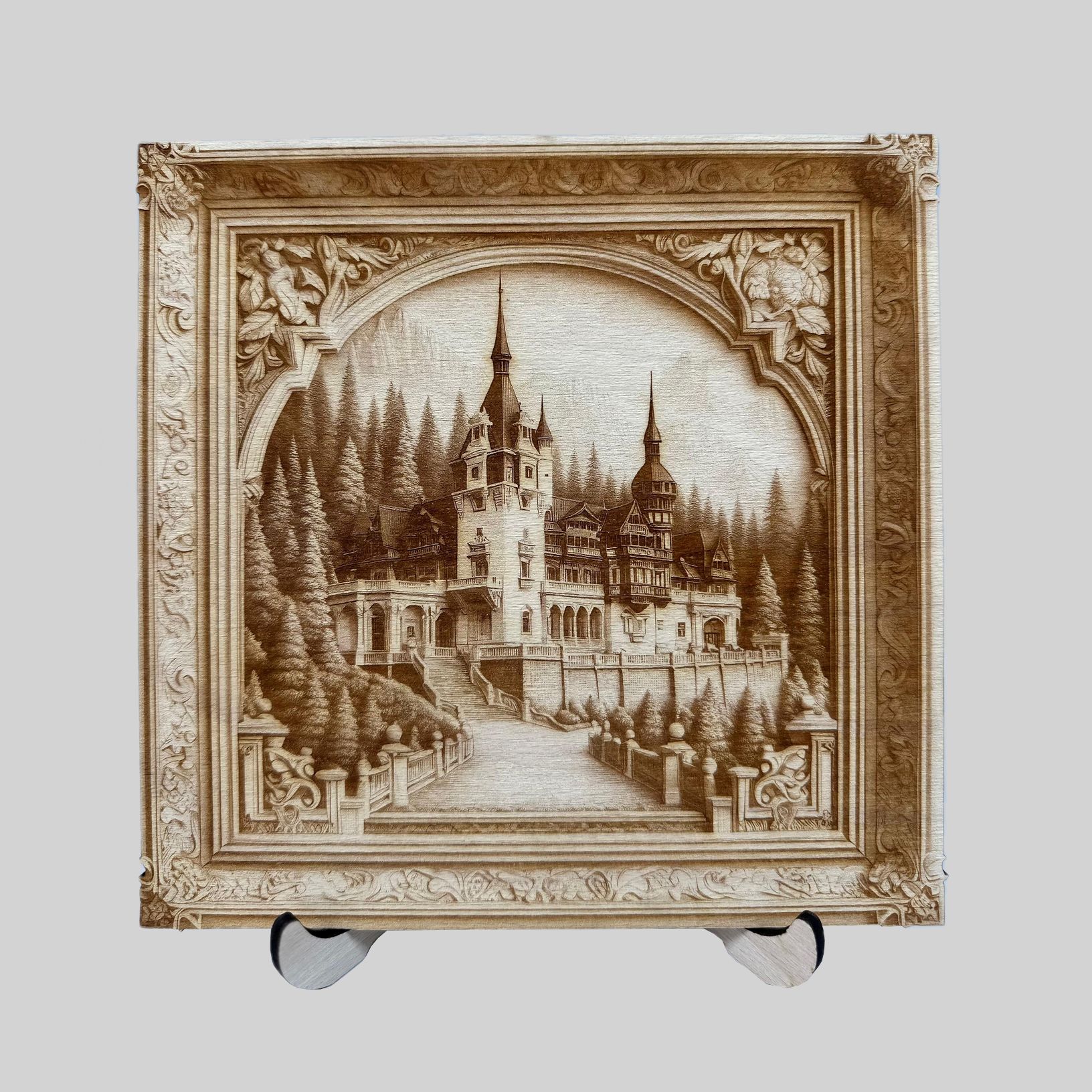 Reproducerea în 3D a castelului pe o placă de lemn adaugă un element de autenticitate și calitate, dând impresia că te afli chiar în fața construcției reale. Detaliile fine, cum ar fi contururile arhitecturale, ferestrele, balcoanele și ornamentele, sunt redate cu mare precizie pentru a recria frumusețea și grandiozitatea Castelului Peleș.